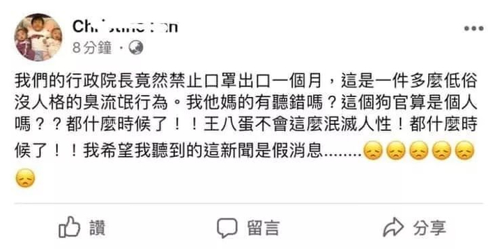 台湾明星范玮琪就此事在自己的脸书小号上爆了粗口,说禁止口罩出口是一件低俗、没人格的臭流氓行为,说苏贞昌是“狗官”,“泯灭人性”。