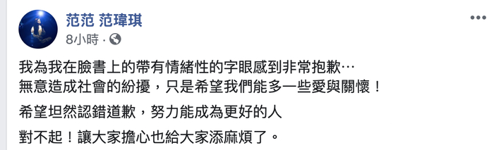 这逼着范玮琪不得不在今天删除贴文,并在自己的官方主页道歉。