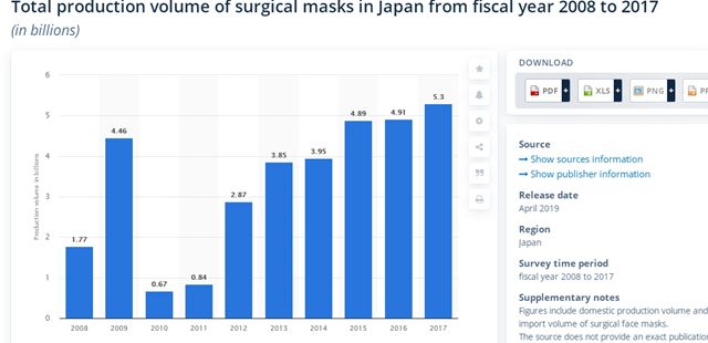 据日本媒体报道,根据调查公司富士经济的数据,2009年全球流感大爆发时,日本口罩的销售额比上年翻了一倍,达到340亿日元(约合23亿元人民币)。流感之后,日本口罩销售额回落,但依旧处于逐年增长的趋势,预计2019年口罩销售额将达到370亿日元(约合25亿元人民币)。