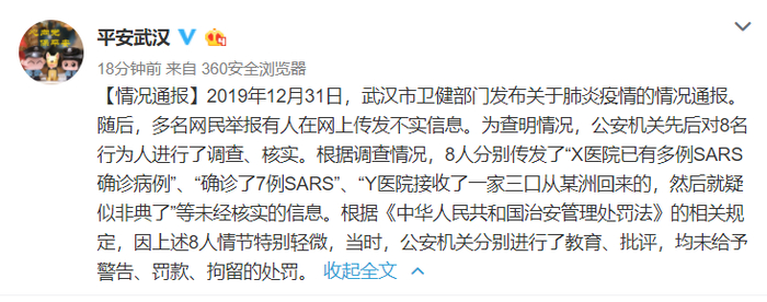今年1月1日,武汉市公安局通报:近期,武汉市部分医疗机构发现、接诊多例肺炎病例。武汉市卫健委就此发布了情况通报。但部分网民在不经核实的情况下,在网络上发布、转发不实信息,造成不良社会影响。公安机关经调查核实,已传唤8名违法人员,并依法进行了处理。
