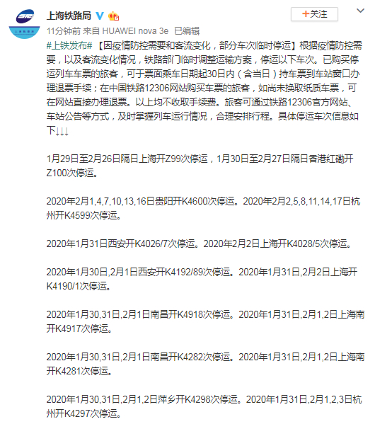 2020年1月31日西安开K4026/7次停运。2020年2月2日上海开K4028/5次停运。