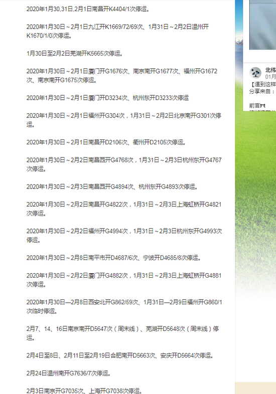 2020年1月30日~2月1日福州开G304次,1月31日~2月2日北京南开G301次停运。