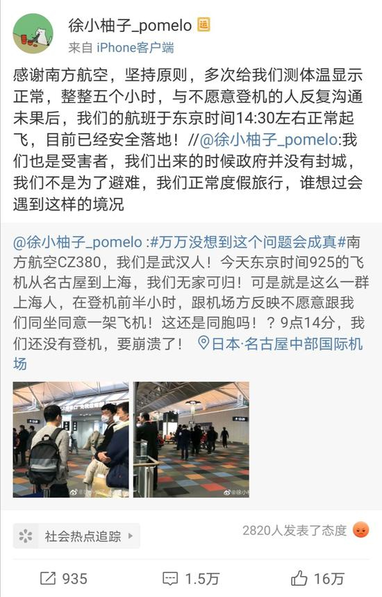 1月27日,南航CZ380由日本名古屋飞往上海,上海乘客觉察到同机有武汉乘客后,向机场反应,不愿与他们同乘一架飞机。最终,武汉乘客得以单独飞回上海,接受检查与医治。