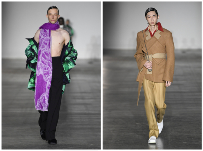 Pronounce是中国设计师品牌,两位设计师周俊和李雨山在2020秋冬系列中加入了许多中国传统理念,比如“紫气东来”围巾,在《水浒传》108将中寻找灵感等。同时也在男装剪裁中加入收腰、裙摆等元素,将东方美学与设计融合在一起。