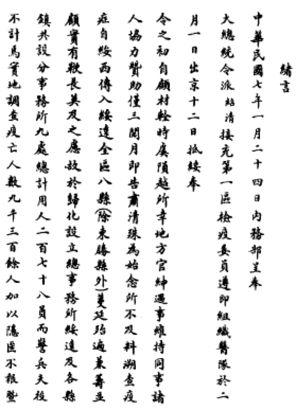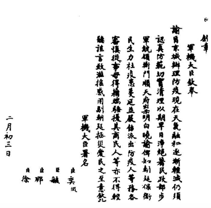 饭岛涉认为,肺鼠疫的防治措施本身,与同时期的日本所实施的方法是一样的,不过,东北的肺鼠疫防治,是在善堂等民间团体和商会、自治会等中间团体的协助下展开的。这不仅反映了社会事业以民间团体为基础这一中国社会的特征,还显现了这是20世纪初以商会及自治会的形式组织起来的中间团体对地域社会影响力的扩大为背景的。19世纪末之前的中国社会,卫生事业等社会事业往往是以“义举”的形式由民间团体来承担,而到20世纪初,中国社会开始逐步朝近代国家式的统治形态发展。这样,卫生的制度化就成了具有方向性意义事件,即借由国家将卫生事业行政化,试图实现个人的身体规律化和统治机构重组,并重组善堂等民间团体将其纳入机构。图为防疫上谕,来自《中国防疫史》。