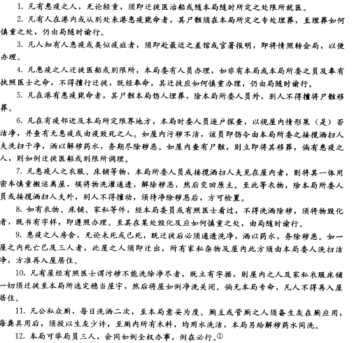 针对1894年鼠疫,上海的公共租界工部局实施了相关的应对策略的同时,海关也强化了对疫病的检疫,并在1899年制定了新的检疫章程。因此,上海检疫行政的发展,是在19世纪末腺鼠疫的流行日渐显著的背景下实现的。虽然当时的上海道台已经认识到了检疫的必要性,但他还是将其当作“善举”来看待,为了设立防疫医院,还要求商会来承担费用。这也是中国卫生制度化,国家将卫生事业行政化的前夜。图为当时港英政府为防治1894年鼠疫而宣布的《香港治疫章程》,图片来自《中国防疫史》。
