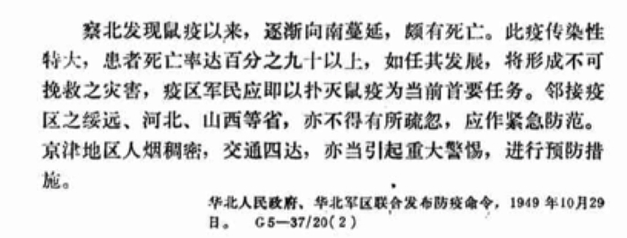 1949年7月,察哈尔省暴发鼠疫。此次鼠疫成了新中国诞生以来第一场防疫战。疫情迅速被报到中央,卫生部十分重视,并迅速调配人力支援察哈尔省。华北军区为了预防鼠疫实施了捕鼠灭蚤、建立检疫站、封锁交通、暂停娱乐场所营业、学校停课等措施,并向苏联求助。由于各项措施执行较好,疫情很快被控制住,并在当年11月就没有出现新病例。此次疫情有66人死亡。图为1949年10月,《华北人民政府、华北军区联合发布防疫命令》。