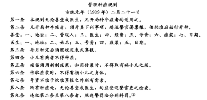 天花疫情在晚清时就有所记载。随着牛痘接种逐渐增多,牛痘术的效果得到了社会认可,但其覆盖面相当有限。相对而言,在南方,牛痘接种比较普遍。从咸丰年间开始,为民众接种牛痘的种牛痘公局开始遍地开花,免费为民众接种牛痘。图片为1909年清末新政期间,清政府颁布的《管理种痘规则》,这使得种牛痘第一次有了明确的规范,也标志着中国防治天花进入正规化的阶段。图片来自《中国防疫史》。