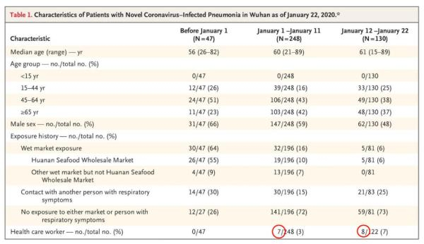 论文显示,武汉医务人员在1月1日至11日感染7人,1月12日至22日感染8人。《新型冠状病毒感染肺炎在中国武汉的初期传播动态》,《新英格兰医学杂志》