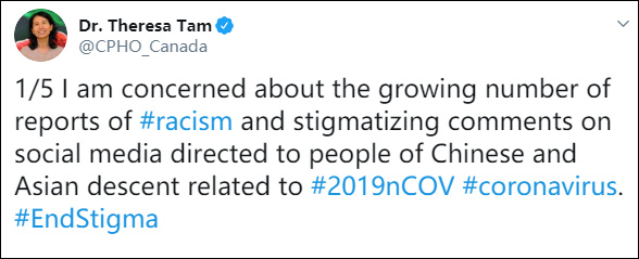 加拿大首席公共卫生官员谭咏诗(Theresa Tam)当地时间31日在社交平台上呼吁,不要因为疫情而歧视中国人和亚洲人。