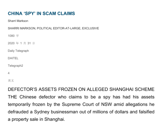 澳大利亚《每日电讯报》1月31日刊登了一篇题为“骗局索赔案中的中国‘间谍’(CHINA ‘SPY’ IN SCAM CLAIMS)”报道,详细讲述了王立强涉嫌诈骗内幕,并在报道中这样说道:“现在,王立强讲述的故事正在逐渐土崩瓦解。”