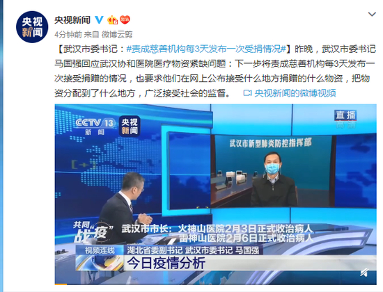 昨晚,武汉市委书记马国强回应武汉协和医院医疗物资紧缺问题:下一步将责成慈善机构每3天发布一次接受捐赠的情况,也要求他们在网上公布接受什么地方捐赠的什么物资,把物资分配到了什么地方,广泛接受社会的监督。