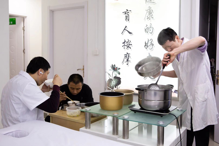 2019年5月10日,“北漂”六年、打工十年的赵明,拥有了这家属于自己的盲人按摩店。店里一共六名师傅,赵明和他们同吃同住,除了记账,还负责买菜、做饭、拖地、做清洁等一切后勤保障。