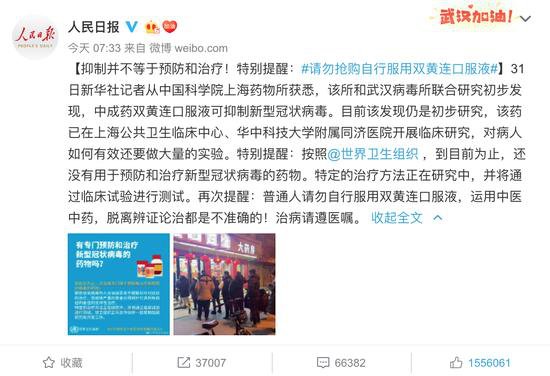 截至发稿,人民日报在微博上已公开表态,抑制并不等于预防和治疗,并特别提醒,请勿抢购自行服用双黄连口服液。