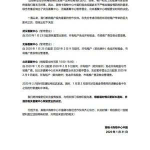 此外,1月31日英格卡购物中心中国发布公告称,三地荟聚中心营业时间调整期间免收所有租户的租金、市场推广费和物业管理费。不同项目有所区别,具体措施如下:武汉荟聚中心(暂停营业),自2020年1月23日起至恢复营业期间,所有租户免收所有租金、市场推广费及物业管理费;无锡荟聚中心(暂停营业),自2020年1月25日起至2020年2月9日期间,所有租户(欧尚除外)免收所有租金、市场推广费和物业管理费;北京荟聚中心,自2020年1月25日起至2020年2月9日期间,所有租户(欧尚除外)免收所有租金与市场推广费。如北京荟聚中心在未来调整营业状态为暂停营业,则自暂停营业之日起至2020年2月9日期间,所有租户(欧尚除外)免收所有租金、市场推广费及物业管理费。