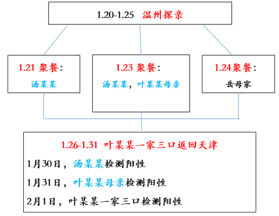 叶姓一家人感染情况值得警醒 在现场,张颖又分析了本市第39、40、41例确诊病例的感染过程。“叶某某一家三口情况比较简单,但是也具有警示作用。他们是温州人,日常生活、工作在天津,1月20日回温州老家探亲。20-25日期间,他们参加了3次聚会:第一次聚餐在21日,汤某某参与;23日,汤某某与叶某某的母亲共同参与;24日叶某某在岳母家聚餐。30日,汤某某被温州当地确诊为新型冠状病毒感染的肺炎病例,31日,叶某某的母亲被检测是阳性,同样被确诊。到了2月1日,叶某某一家三口全部被确诊为新型冠状病毒感染的肺炎病例。都是聚餐惹的祸。”