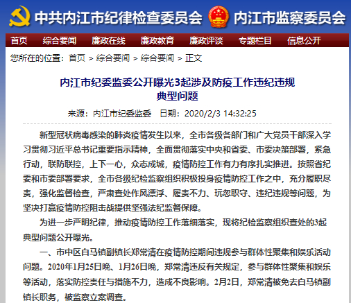 据内江市纪委官网公布:2020年1月25日晚、1月26日晚,郑常清违反有关规定,参与群体性聚集和娱乐等活动,落实防控责任与措施不力,造成不良影响。2月2日,郑常清被免去白马镇副镇长职务,被监察立案调查。