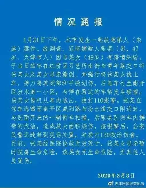经天津网警与属地警方核查,上述文字内容系谣言,真实情况通报如下:1月31日下午,天津市发生一起故意杀人(未遂)案件。谣言中被烧伤人员为犯罪嫌疑人张某。张某因与某女有感情纠纷,于当日驾车在红桥区习艺所南街与青年路交口将该女及其母亲撞倒,并强行将该女拽上车,持刀将其颈部和手腕划伤,后驾车行至南开区汾水道一小区,与停在路边的车辆发生碰撞。该女借机从车内逃出,拨打110报警。张某在驾车逃窜至南开区咸阳路与汾水道交口附近时,与迎面开来的一辆轿车相撞,后张某引燃车内携带的汽油,造成大面积烧伤。