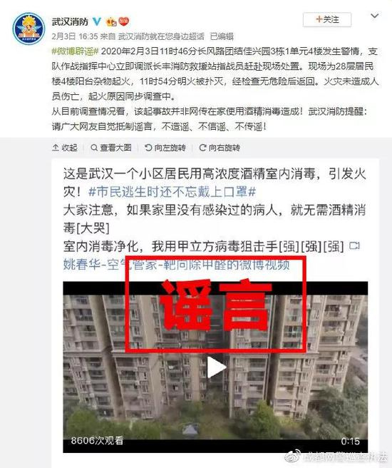 经查,该视频所涉内容实为2020年2月3日11时46分武汉市长风路团结佳兴园3栋1单元4楼所发警情。从目前调查情况看,该起事故并非网传在家使用酒精消毒造成!