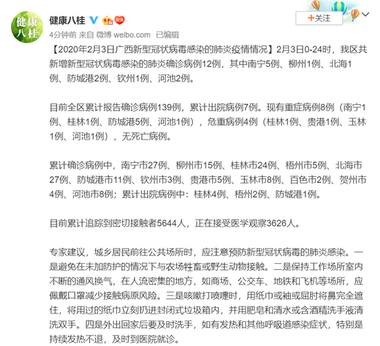 目前全区累计报告确诊病例139例,累计出院病例7例。现有重症病例8例(南宁1例、桂林1例、防城港5例、河池1例),危重病例4例(桂林1例、贵港1例、玉林1例、河池1例),无死亡病例。