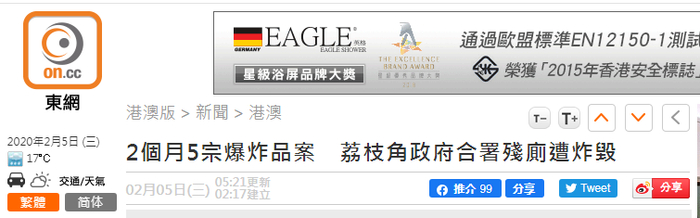“东网”归纳称,香港近两个月内发生5宗爆炸案件,其中三宗发生于1月。第一宗案件发生在上月(1月)27日凌晨2时31分,明爱医院急症室的男厕发生爆炸;第二宗发生于同日22时20分,佐敦道一个厕所内发生爆炸及大火;第三宗案件发生于翌日(1月28日)上午10时25分,深圳湾口岸有保安员听到疑似爆炸的巨大响声,并在一个垃圾桶内发现一个类似爆炸装置。爆炸品处理课(EOD)人员到场检查,确认为一个遥控炸弹,包括电话引爆装置及爆炸品。