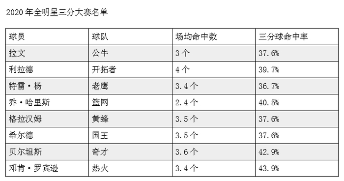新京报讯(记者 徐邦印)今天,NBA官方公布了2020年全明星周末三分大赛的参赛名单,包括利拉德、特雷·杨、卫冕冠军乔·哈里斯以及主场作战的拉文在内,共有8名球员参赛,今年三分大赛的赛制也有所调整。