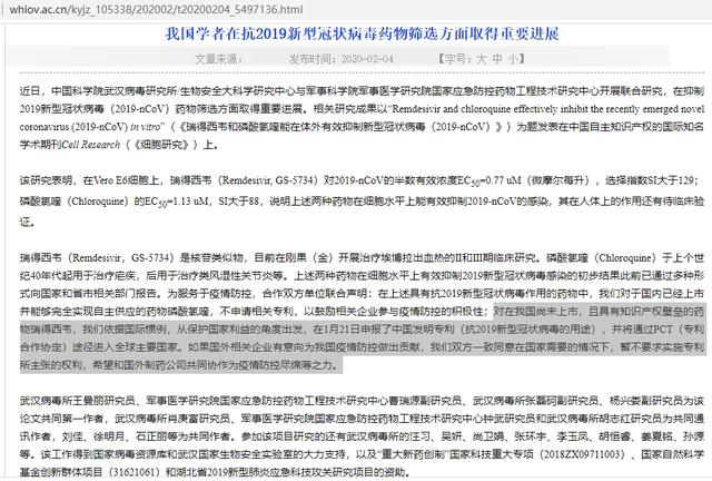 原标题:新冠肺炎潜在有效药瑞得西韦,武汉病毒所等申报中国专利