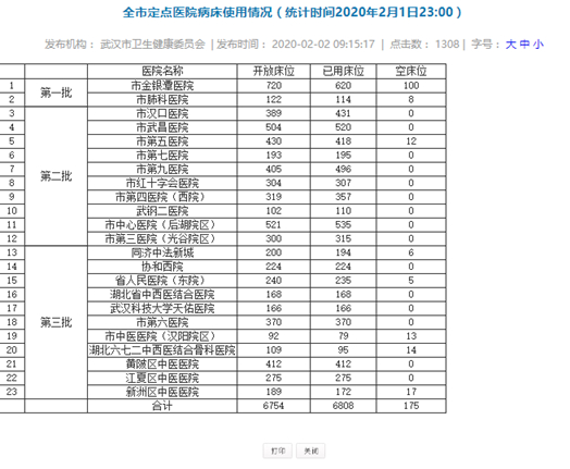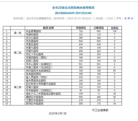 而武汉市卫健委最新公布的官方数据,部分证实了这一推测。2月1日起,武汉市卫健委开始向社会发布全市定点医院床位情况。数据显示,1月31日,武汉全市共23家定点医院有14家空床位数为0。