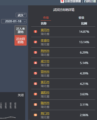 黄冈病例超千例,固然有离武汉较近、两地人员往来频繁的因素。以1月18日为例,武汉迁出地中排首位的就是黄冈。