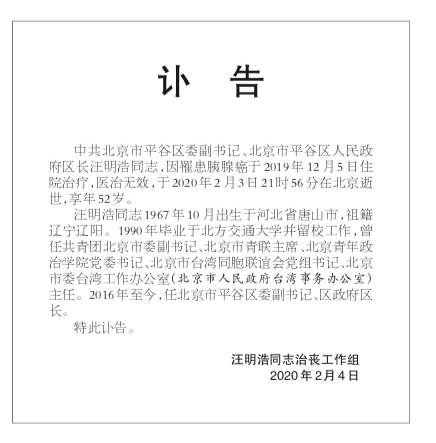 北京《平谷报》6日发布讣告:平谷区委副书记、区长汪明浩因罹患胰腺癌于2019年12月5日住院治疗,医治无效,于2020年2月3日21时56分在北京逝世,享年52岁。