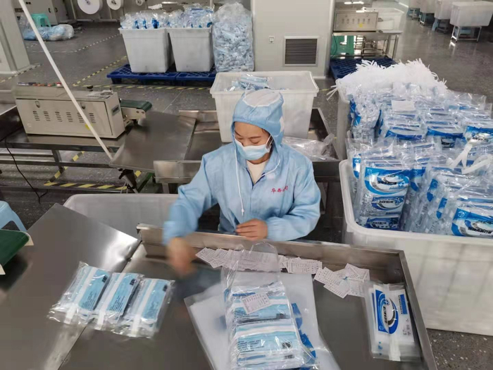 32岁的薛巧娜是河南长垣华西卫材有限公司的女工,负责在流水线上包装一次性医用外科口罩。河南长垣,被称为“中国医疗耗材之都”,拥有各类卫材企业70多家,经营企业2000多家,平时占据全国市场销量50%以上。