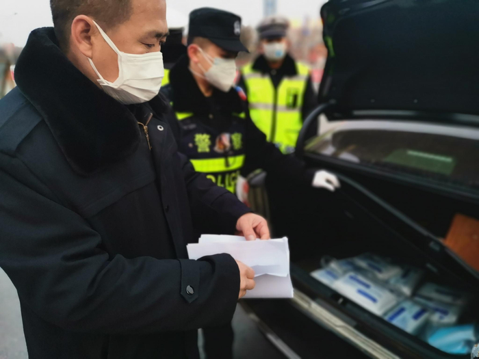 民警称,对离开长垣的车辆一律盘查,避免假冒伪劣产品和未办理手续的正品口罩流出长垣。