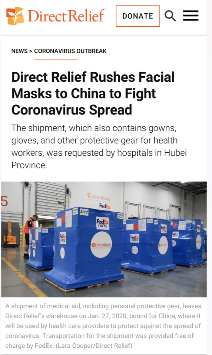 Direct Relief:这些口罩和其他物资是从Direct Relief的加利福尼亚仓库运来的。作为应对世界各地紧急情况的公益组织,Direct Relief保持着大量医疗物品的库存。Direct Relief会提前购买物资,以应对大规模的紧急情况,比如目前正在扩散的疫情。