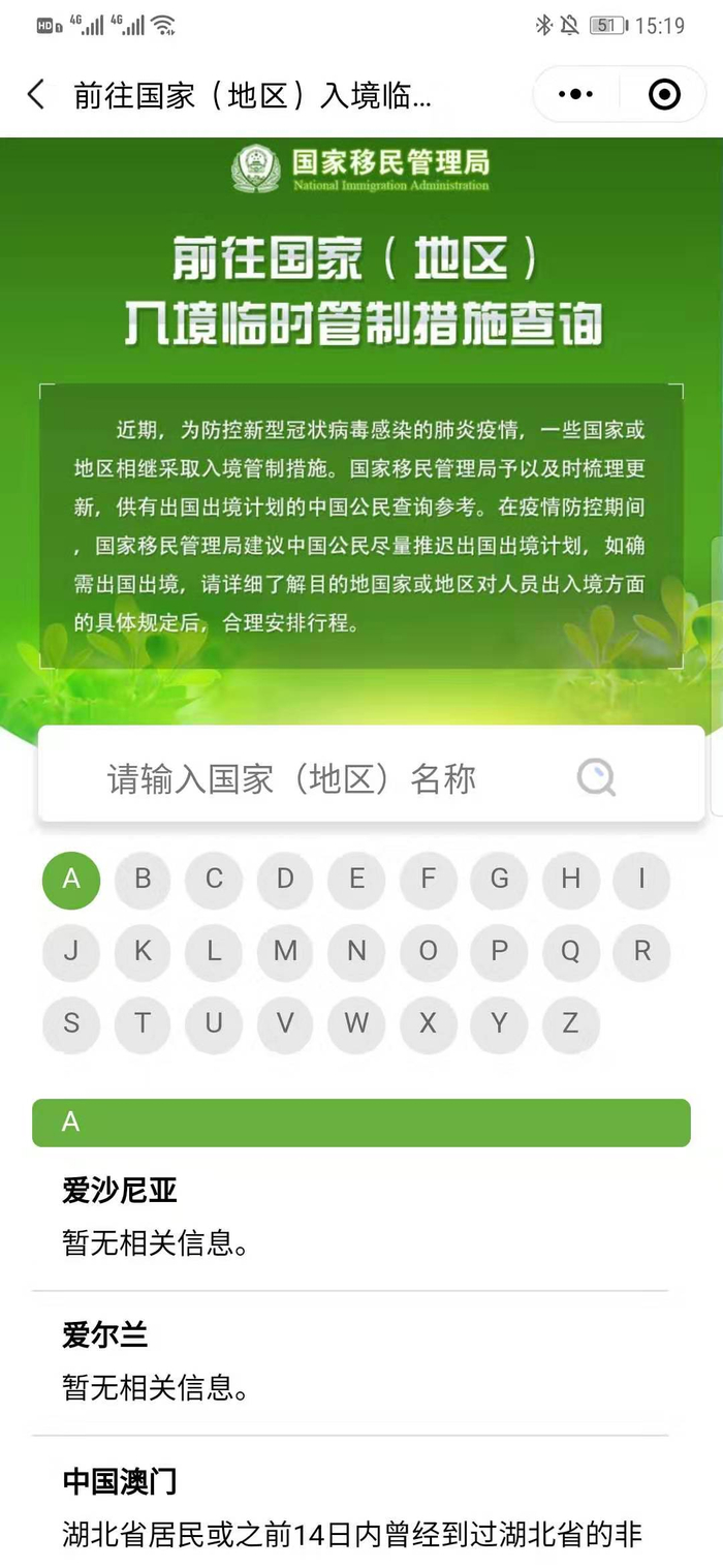 点击“前往国家(地区)入境临时管制措施查询”,可以按国家(地区)首字母查询各个国家(地区)的临时入境管制措施,比如爱沙尼亚暂无相关信息,中国澳门则要求:湖北省居民或之前14日内曾经到过湖北省的非澳门居民,入境时必须出具由合法医疗机构发出的无感染新型冠状病毒的医生证明书,无上述证明的禁止入境;所有内地劳务人员入境澳门时须同时出示居民身份证。