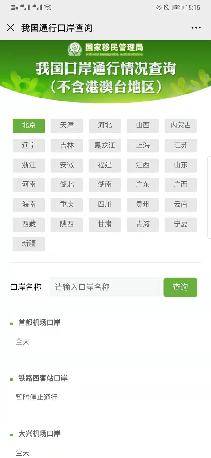 点击“我国口岸通行情况查询”,可以选择省级行政区,查看各个口岸的当前的通行情况。比如北京,首都机场口岸全天开放;铁路西客站口岸,暂时停止通行;大兴机场口岸全天开放。