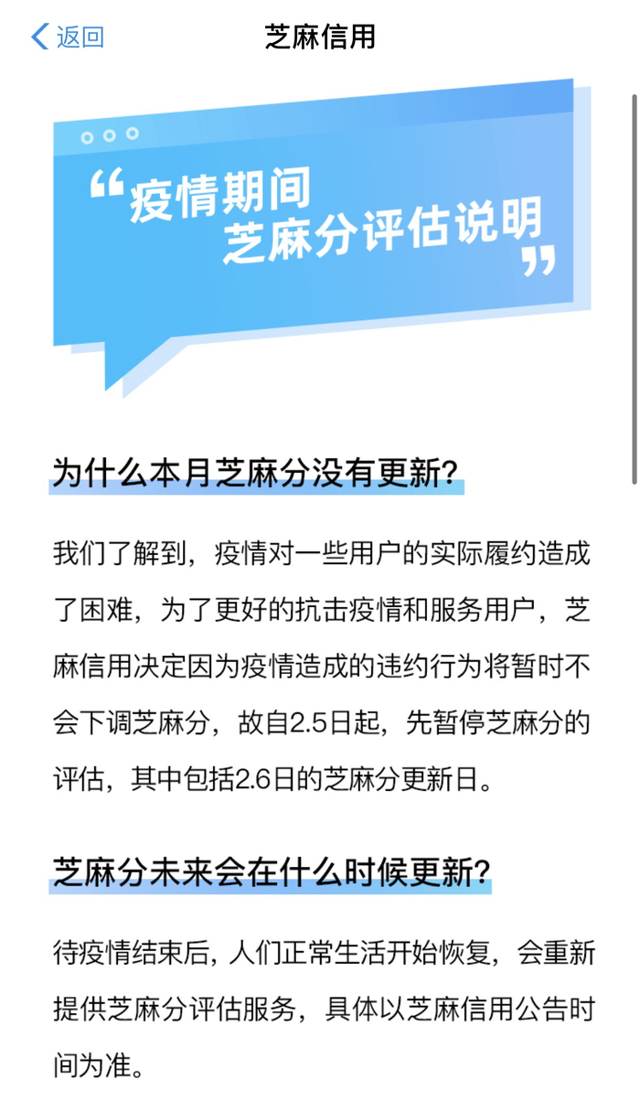原标题:受疫情影响,支付宝芝麻信用分暂停评估