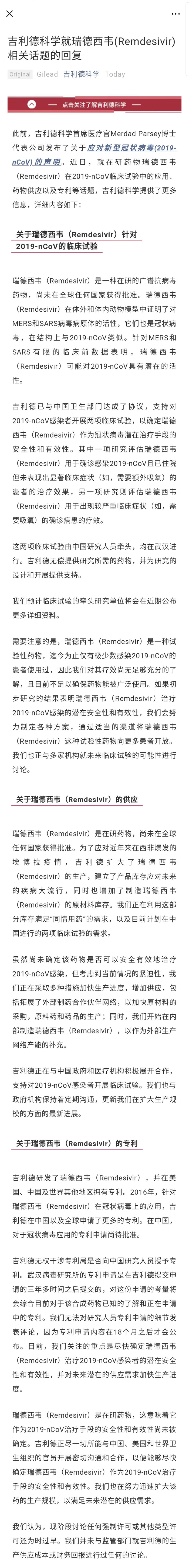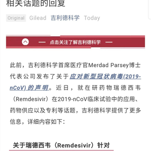 新京报快讯(记者 许雯)针对在研药物瑞德西韦(Remdesivir)对于新冠病毒的临床试验及专利申请等话题,瑞德西韦研发企业吉利德公司2月8日通过微信公众号“吉利德科学”(认证主体:吉利德(上海)医药科技有限公司)进行集中回应。