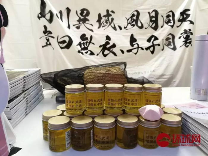 在女孩身后,展台上摆满了日本产的樱花蜂蜜,每当有人捐款,就可以得到一瓶蜂蜜和一本《中国纪行》杂志。这些深大寺养蜂园的蜂蜜,由养蜂人杉沼女士无偿提供。她对环球时报-环球网记者说,武汉的樱花很有名,她特制了100瓶樱花蜂蜜,感谢捐款的人。筹集的全部资金将通过中国驻日大使馆发布的渠道捐赠,用来支援武汉人民抗击“新冠肺炎”。杉沼还说,“祈祷中国和武汉的疫情能早日结束。”值得一提的是,该展台还贴出一行醒目的标语:“山川异域、日月同天;岂曰无衣、与子同裳;加油武汉,加油中国”。