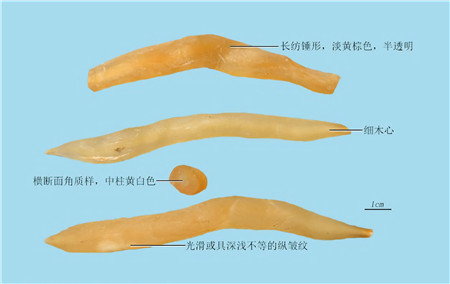 天冬:干燥的块根呈长圆纺锤形,中部肥满,两端渐细而钝,长6~20cm,中部直径0.5~2cm。味甘微苦。养阴清热,润燥生津。主治肺结核,支气管炎,白喉,百日咳,口燥咽干,热病口渴,糖尿病,大便燥结;外用治疮疡肿毒,蛇咬伤。主产广西、四川、贵州等地。
