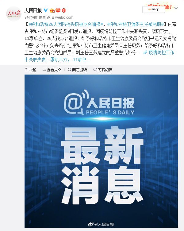 原标题:呼和浩特26人因防控失职被点名通报,呼和浩特卫健委主任被免职