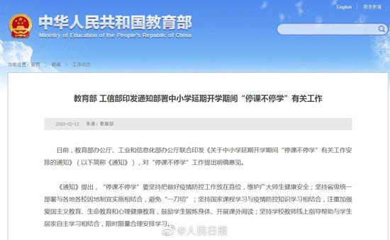 原标题:教育部部署停课不停学#:#避免学生网上学习时间过长
