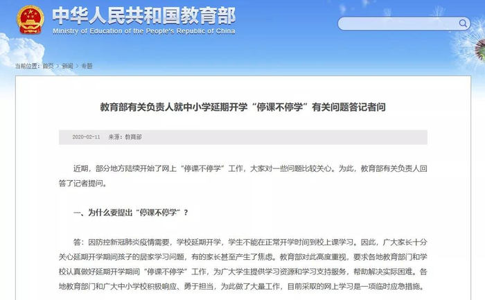 刚刚,教育部有关负责人特别就中小学延期开学“停课不停学”有关问题进行了回应。