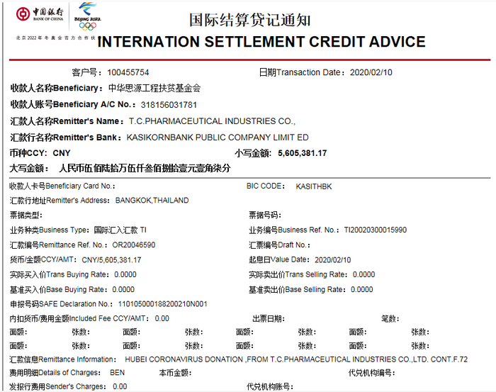 新京报讯(记者 王卡拉)新冠肺炎疫情牵动着海外华人华侨的心。面对突发疫情,泰国华人华侨心系祖国,捐款捐物助力疫情防控。2月12日,新京报记者从中华思源工程扶贫基金会(以下简称“思源工程”)获悉,泰国天丝集团向基金会捐款2500万泰铢,折合人民币约560余万元(按当日外汇汇率结算),用于采购负压救护车等防治疫情急需的医疗物资。