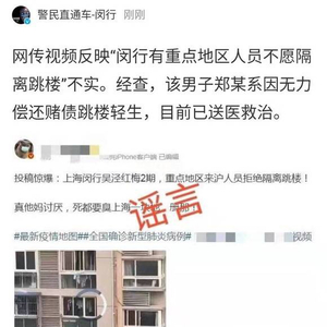 2月11日,一条所谓“湖北人拒绝居家隔离在闵行区吴泾镇一小区跳楼”的视频出现在网络社交平台,并在多个微信群中转发扩散。当晚,闵行公安分局官方微博辟谣:“该男子系无力偿还赌债跳楼轻生,目前已送救治。”记者从闵行警方了解到,跳楼男子已无生命危险。