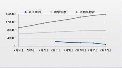 但在疑似病例减少的同时,湖北省尚在接受医学观察的人数依然保持在7万多人(2月12日,77308人)的规模。而累计追踪密切接触者则在继续上升,从2月5日的90997人,增加到2月12日的158377人。