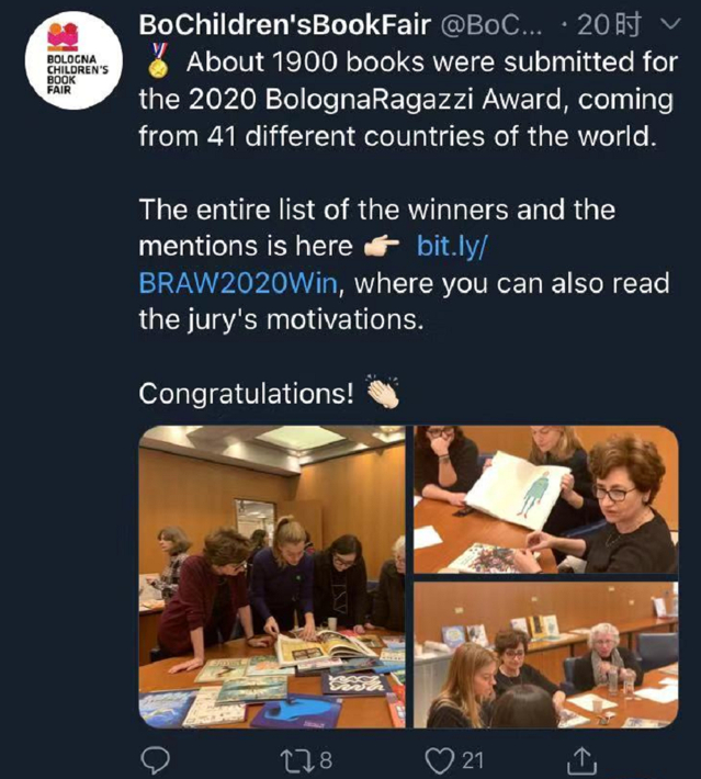 昨日,博洛尼亚国际童书展推特上也公布了这一消息。