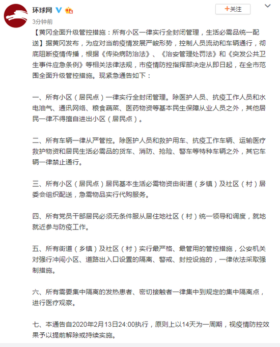 七、本通告自2020年2月13日24:00执行,原则上以14天为一周期,视疫情防控效果予以提前解除或持续实施。