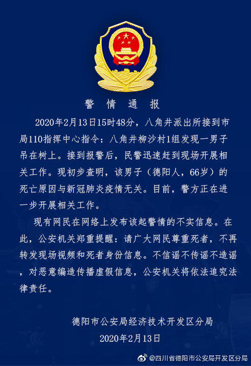 四川省德阳市公安局开发区分局13日发布警情通报,通报称2020年2月13日15时48分,八角井派出所接到市局110指挥中心指令:八角井柳沙村1组发现一男子吊在树上。接到报警后,民警迅速赶到现场开展相关工作。现初步查明,该男子(德阳人,66岁)的死亡原因与新冠肺炎疫情无关。目前,警方正在进一步开展相关工作。