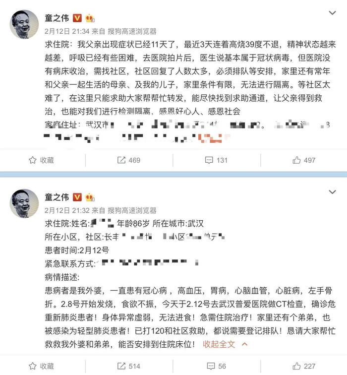 童之伟2月12日微博截图。微博内容包括求助者提供的姓名、地址和联系方式,便于对接联系。之后,当求助者得到救助,他们会希望撤下个人信息。截至当天,图中两位求助者尚在求助中。图中信息已作处理。