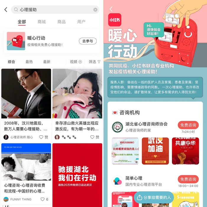 在心理援助平台上线之前,小红书已邀请湖北省心理咨询师协会、壹点灵、壹心理、简单心理、抑郁研究所等咨询机构的专家在小红书上参与“武汉加油”的公益直播,通过直播连线等方式,向普通用户科普疫情期间心理调节的重要性及简单的自我调节方式,辅助调节心理状态。